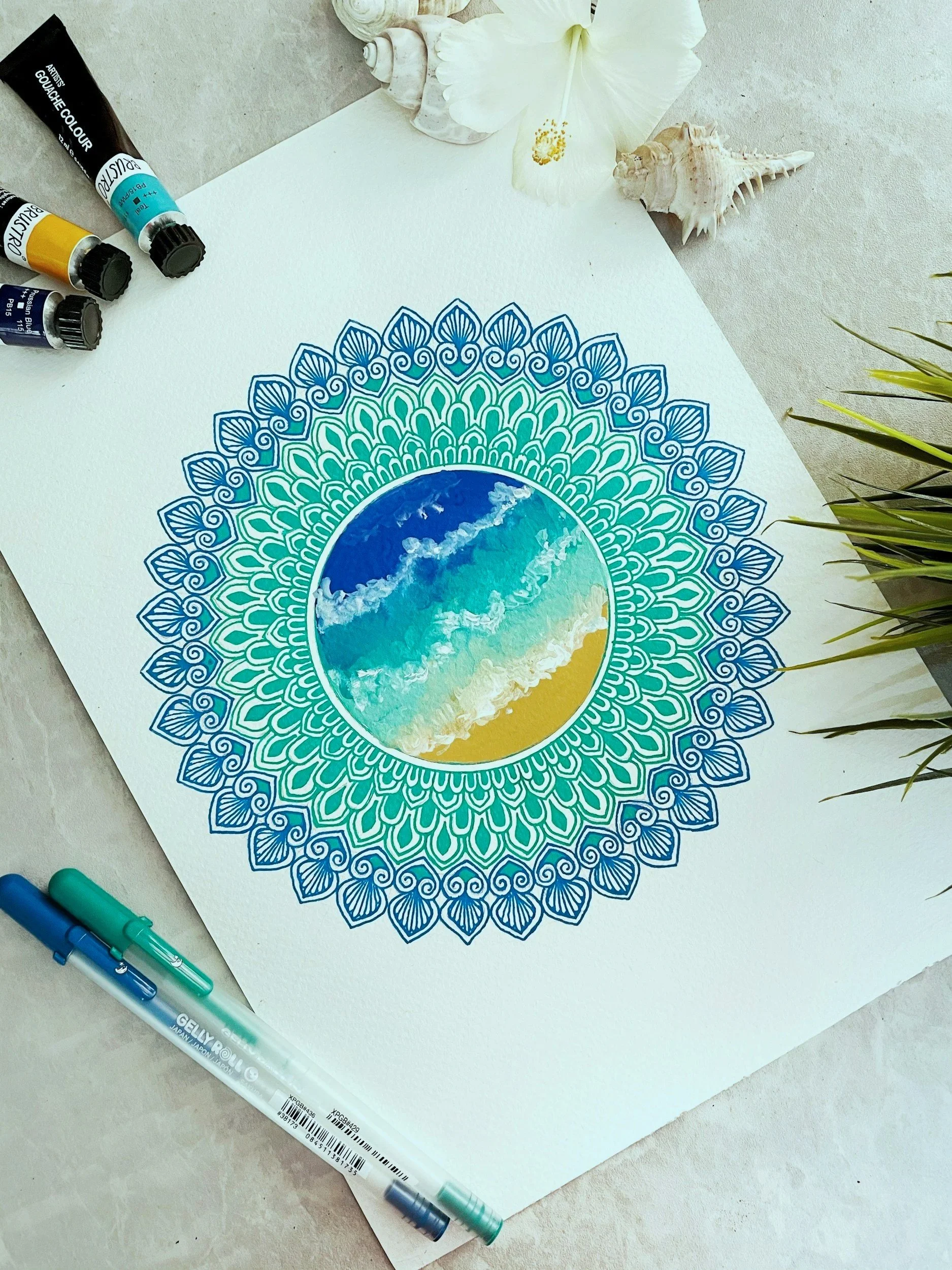 A watercolor and ink art piece of a colorful mandala pattern with green, yellow, and pink leaves and flowers, with watercolor paints, clothespins, and a glass of coffee on a white surface.